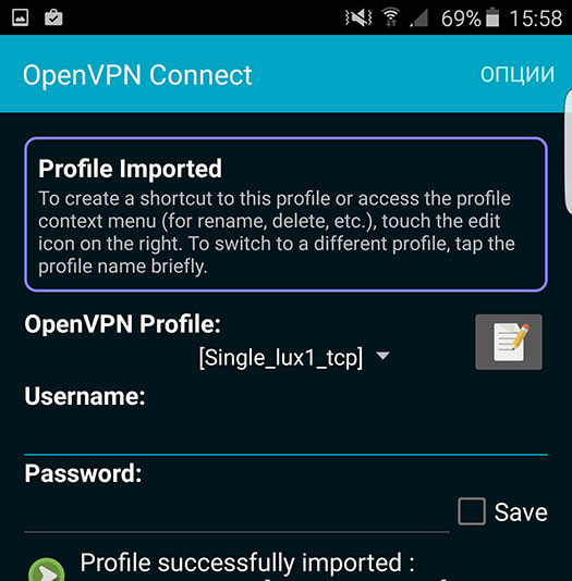 3. Запустите OpenVPN и выберите Опции - Import - Import profile from SD card